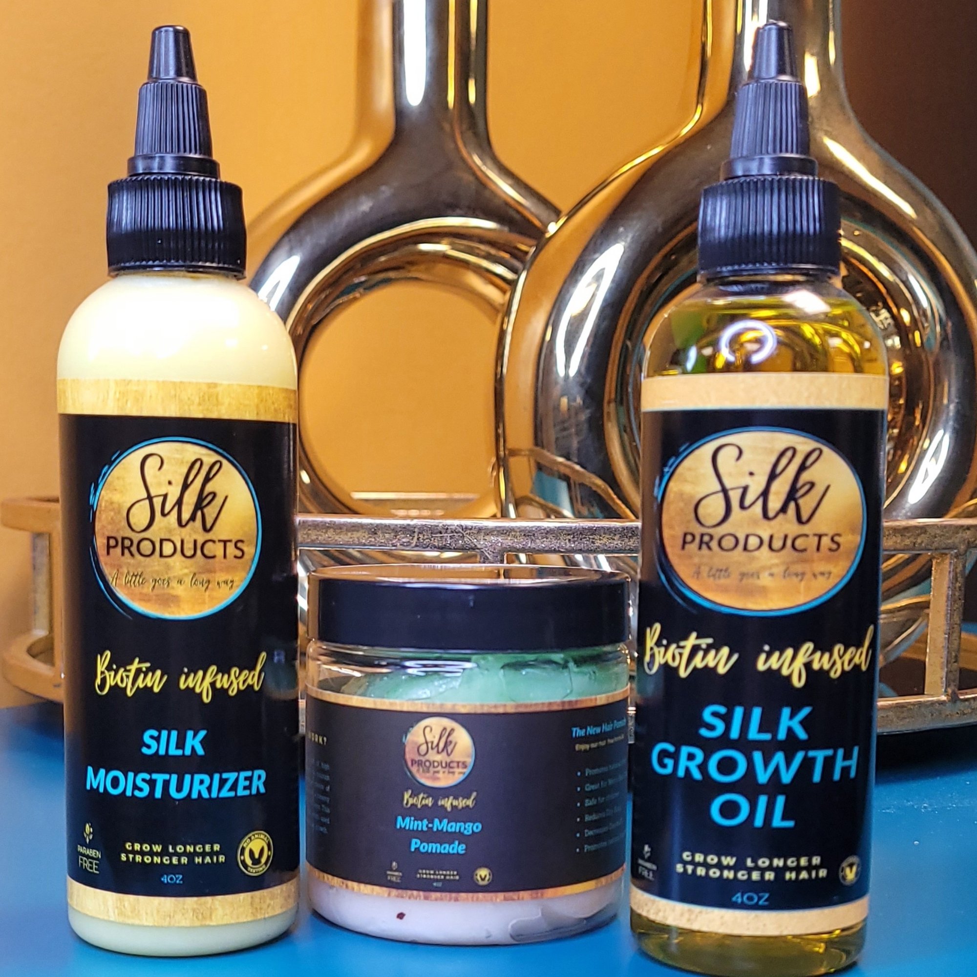 Silk Moisturizer (liquid) is our #1 seller! It will not only moisturizes your hair and ends, but it also promotes hair growth. This creamy product contains essential vitamins, biotin, keratin and organic oils and butters! The tip applicator makes it convenient to moisturize scalp while wearing protective braids, extensions and weaves, yet it is also great for naturals. Even great for men's hair and beards!